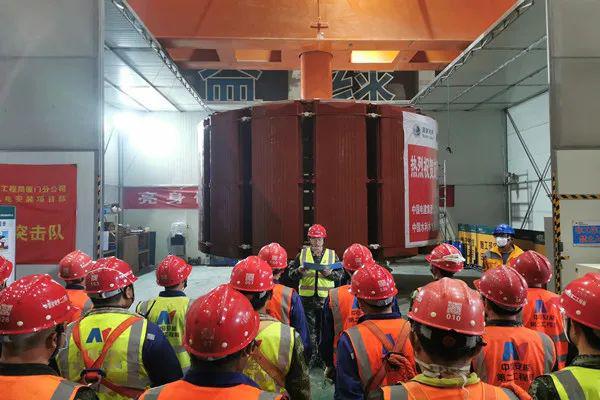 吊裝過程中,現場進行技術交底,相關人員各司其職、各盡其責,兩臺載重250噸的橋機通過平衡梁專用工具,吊起轉子,緩緩平移出工位棚,向著機坑方向移動,上機架、下機架處作業人員嚴格監視著轉子進入定子的位置,配合調整方向、核對同心度,確保轉子準確吊入定子中心,經過近兩個小時的連續奮戰,2號機組轉子順利與發電機大軸緊密連接,順利吊裝成功。