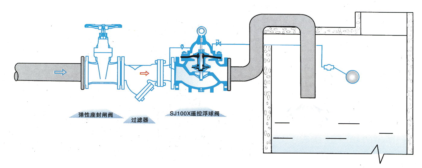 該閥主要安裝于水池或水塔的進口處,當水位達到設定高度時,主閥由浮球導閥控制關閉進水口停止供水、當水位下降后,主閥由浮球導閥開關控制打開進水口向水池或水塔供水,實現自動補水。