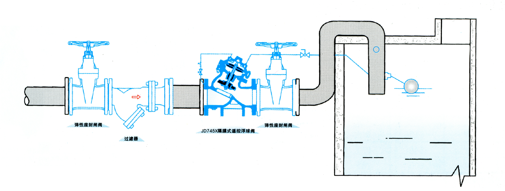 安裝在水池、水塔的進水管道中,當水池水位達到預設定水位時,閥門自動關閉;當水位下降時,閥門自動開啟補水。