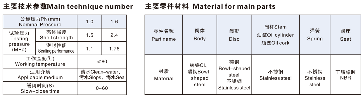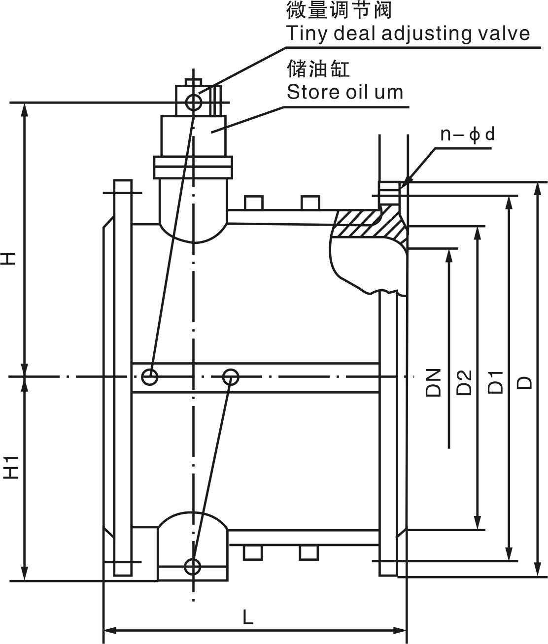 主要由閥體、兩塊半圓閥瓣、回位彈簧、儲油缸、緩閉小氣缸組、針型閥(微量調(diào)節(jié)閥)組成。其原理主要依靠進(jìn)口介質(zhì)的推力作用,將兩塊閥瓣平穩(wěn)推開。在此同時(shí),進(jìn)口的壓力介質(zhì)進(jìn)入油缸內(nèi)活塞的下部,推動活塞,將活塞上部的油通過針型閥分別壓入閥體兩側(cè)的小氣缸尾端,使小氣缸內(nèi)的活塞桿伸出。當(dāng)進(jìn)口介質(zhì)壓力下降低于出口壓力時(shí),介質(zhì)將產(chǎn)生回流,此時(shí)閥瓣在彈簧和介質(zhì)回流的作用下,將自動關(guān)閉。但由于活塞桿處于伸出的位置,頂住閥瓣不能全部關(guān)閉,還剩有20%左右的面積使介質(zhì)通過,從而起到了消除水錘的作用。閥瓣被活塞分成先快速關(guān)閉后緩慢兩步關(guān)閉,達(dá)到既防電機(jī)逆轉(zhuǎn)又起消除靜音作用。