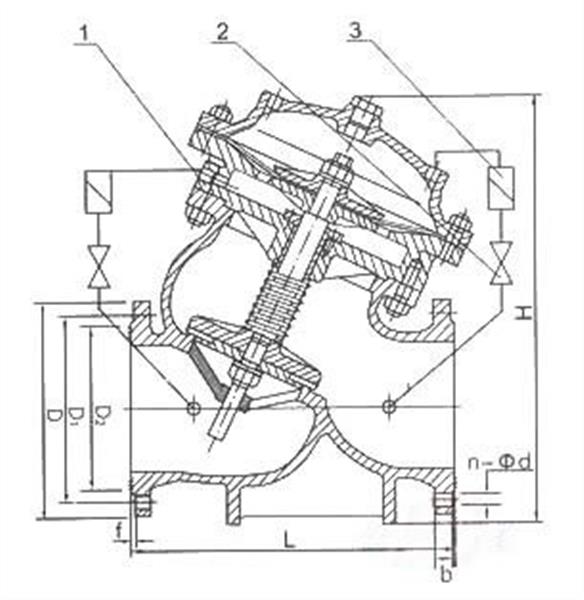 JD745X 多功能水泵控制閥由主閥和調節閥及接管系統組成,閥體采用直流式閥體,主閥控制室為膜片式或活塞式的雙控制室結構,控制室比一般水力控制閥增加了一個,增加了對主閥的控制功能,實現了對水泵出口的緩慢開啟、全開、緩閉、截止等多功能控制,實現了一個閥門、一次調節對水泵出口的多功能控制。本閥門安裝在水泵出口端,順序實現緩慢開啟、全開、速閉、緩閉等功能。
